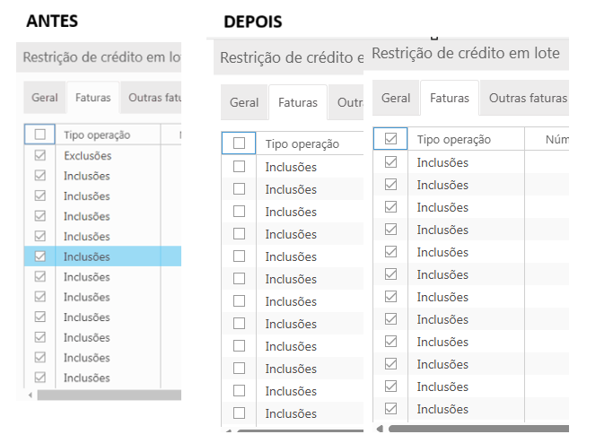 Ao marcar ou desmarcar o checkbox principal dos registros listados na coluna "Faturas", o mesmo demonstrava em branco. Por isso, informamos que foi corrigido: